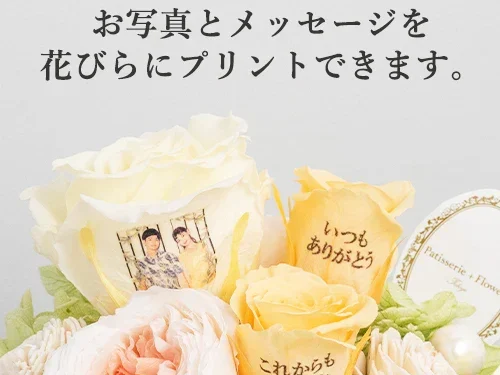 結婚記念日、結婚のお祝い、誕生日プレゼント、母の日や父の日、敬老の日など、特に出産祝いに子供が誕生した日をメッセージで花びらにプリントして贈るなど、とても思い出に残る贈り物として喜ばれます。貴方の想いや日頃の感謝をメッセージにこめて贈られてはいかがでしょうか?さらにメッセージに加え、誕生石のラインストーンを添えることもできます。オーソドックスな形、やハート形のラインストーンが選べ、ダイヤモンドカラーの可愛いハートを加えると、さらにゴージャスになります。受け取った方が必ず笑顔になるフラワーアレンジメントが出来上がります。