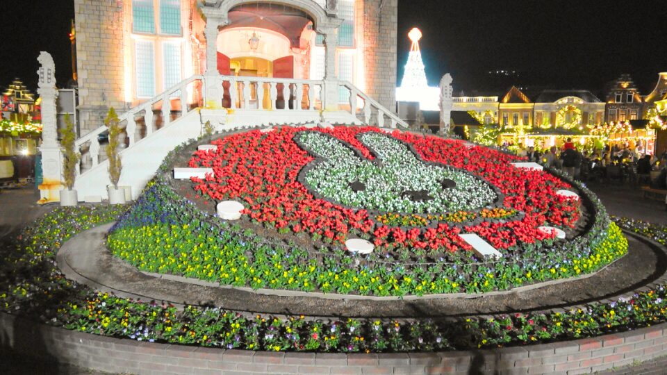 日中とは異なる夜にしか出会えない光の大国。ライトアップされハウステンボスは別世界へと姿を変えます。ショーが行われた真裏にはミッフィーが …
