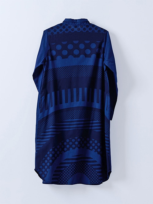おしゃれと快適さをそなえた”コラボシャツワンピース”背中の個性的なプリントが印象的、ワンピースとしても羽織りとしても活躍、軽やかで爽やかな肌ざわり、一日中快適に過ごせます。